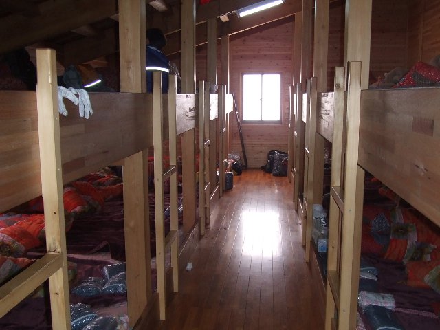 山小屋の中。 一つの布団に2人寝かされる状態です。