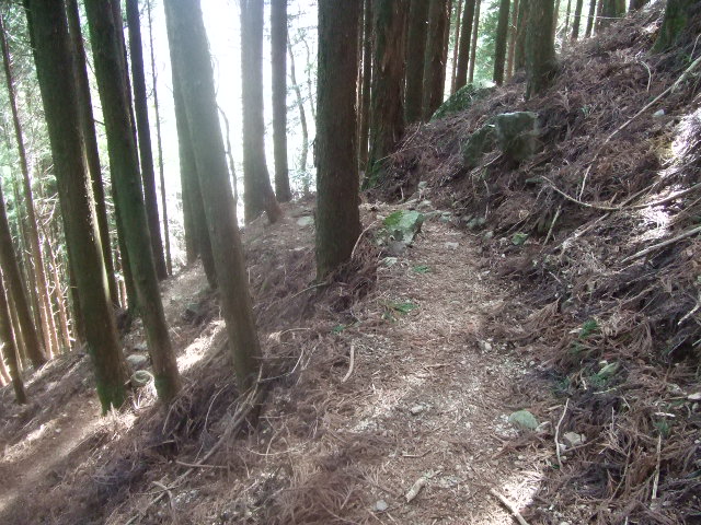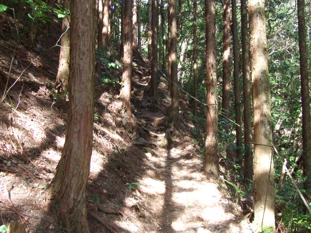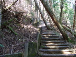 穂積神社からしばらく歩くと、このような急な坂を上ることになります。階段が整備されているのですがこのあたりが一番きつい箇所でした。後でわかったのですが、階段を使わずに緩やかな登山道も平行してあり、そちらを歩くのも良いかもしれません。 |