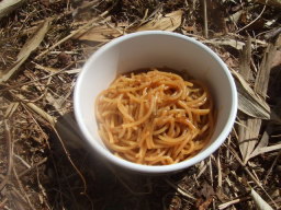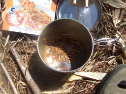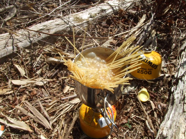 が、鍋が小さいと失敗します。ボロボロ外にこぼれてしまい、地面に落ちた麺を戻すのが大変です。このように小さな鍋だったら最初の半分に折って入れるべきでした。 |