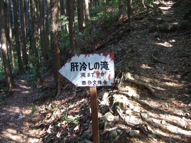 途中、「肝冷しの滝」と云う看板あったので行ってみました。1〜2分で滝に着きます。 |