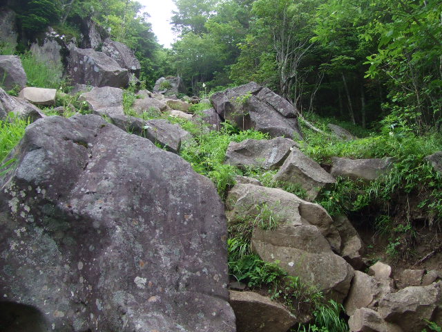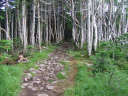 しばらくのぼるとだんだんと岩場が多くなり急斜面になっていきます。白樺の中を通り、カラマツ林の中を進んでいきます。 |