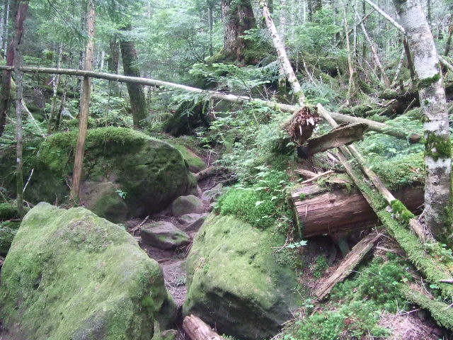 ジェラシックパーク的なうっそうとした林の中を通ります。苔がびっしりと着いた岩場を慎重に進みます。一人じゃ通りたくないですね。 |