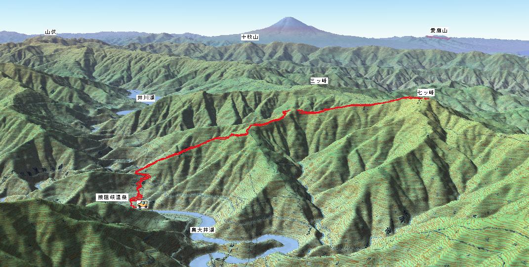 手前に奥大井湖、その向こうは寸又三山(朝日岳、前黒法師岳、沢口山)が雲に隠れています。 |