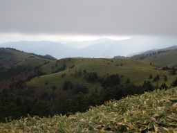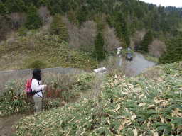 ちょっと急な山道を下ると神坂峠に出ます。先ほど歩いてきた林道とここで合流します。中津川方面から車で来た人たちもちょっとさきにある駐車場に車を止め、恵那山や富士見台高原方面に向かうようですね。 |