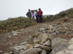 ともあれ、歩き始めて3時間。皆さん無事に山頂に到着しました。 セルフタイマーかけて記念撮影。カメラ斜めじゃん・・・ |