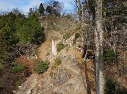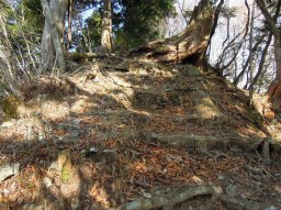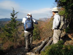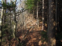 登山道からはすぐに急な山道になります。尾根ずたいの登山道を歩きます。杉の植林地帯や雑木林などの変化がある道を歩くので飽きることはありません。 |