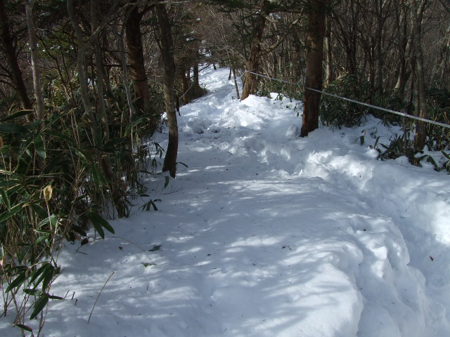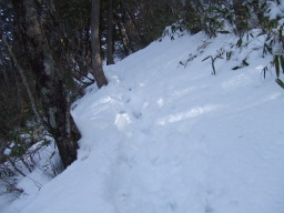 頂上に近づくにつれ雪も深まってきました。 前に歩いた人の踏跡を同じように踏んで進めばいいのですが、そうでないとふくらはぎあたりまでズボッと雪にめり込んでしまいます。一歩一歩足をしっかりあげて進みますが慣れないせいかすごく疲れました。 |