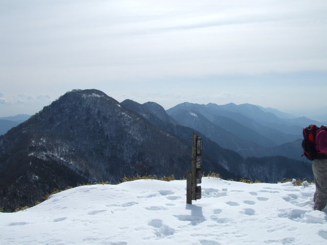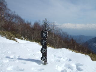 歩き始めて2時間半、やっと頂上に着きました。著上は広々としていて視界が開けます。 |