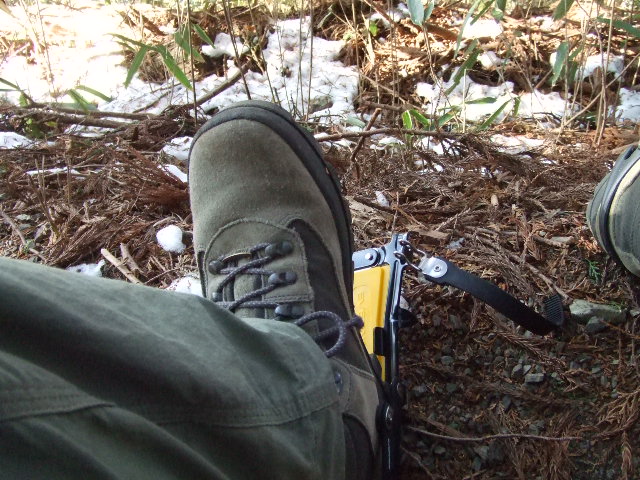 生まれて初めてのアイゼン歩行です。1年ほど前にネットで購入した”エバニューEBY015” 6本爪タイプの奴です。スノボーを履く要領で簡単に装着できました。 |