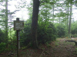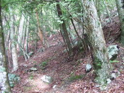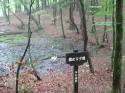 頂上のすぐ下の「鹿のヌタ場」というところ。このあたりはブナ科の大木が多く見られます。 |