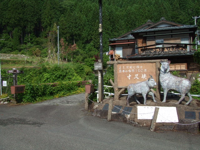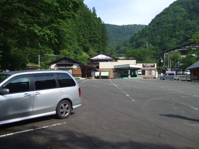 寸又峡温泉街入口の大きな無料駐車場に車を止めスタートします。 |