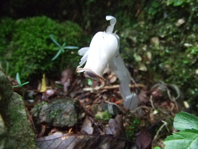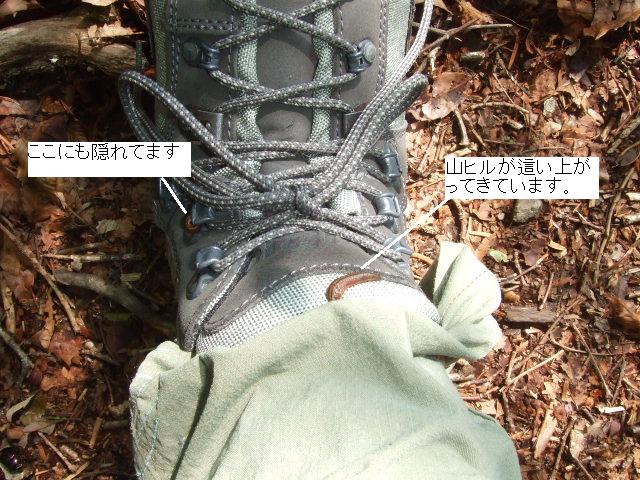 しばらくすると、相棒が足の異変に気づきます。山ヒルに噛まれたようです。写真はすでに山ヒルを取った後ですが靴下の上からでもなかなか取れなかったようです。出血も多く、下山した時にはこの血液痕も5倍ぐらいに広がってました。 |