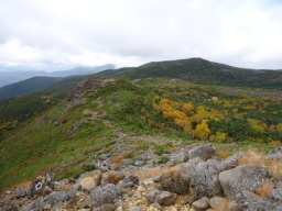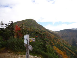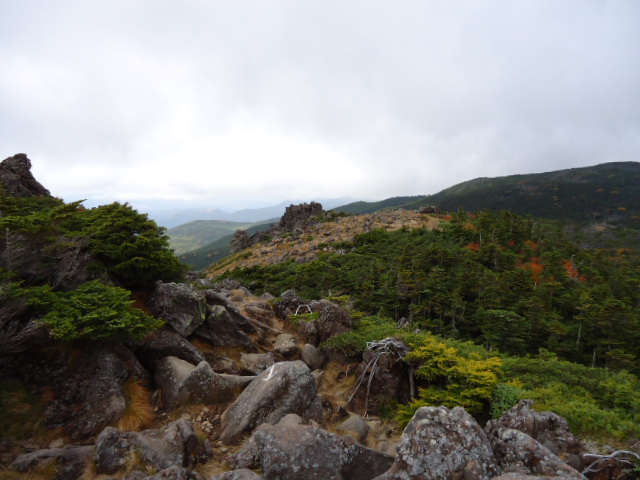 西尾根を進んでいくとだんだんと視界が開けてきて、南の方向には硫黄岳や赤岳の雄姿が見え始めます。 |