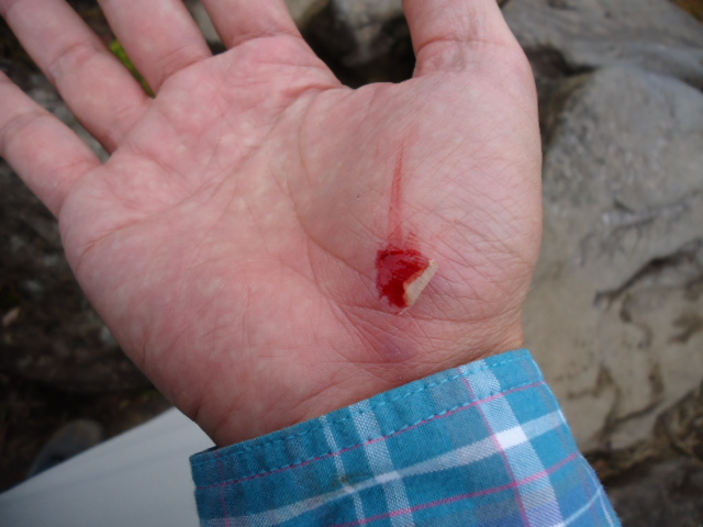 頭の中でではこけている自分がイメージされているんですが体が動かない。思わず手をついたらこの有様です、手袋していたのにね。