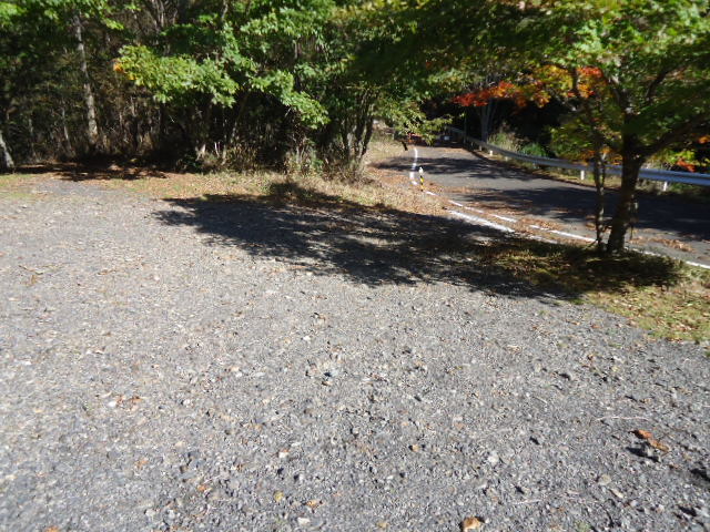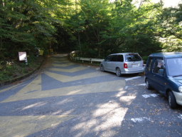 50分程で林道と出合います。ここの駐車場まで車で来る予定でした。当たり前ですが1台も車は止まっていません。 |