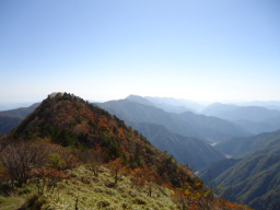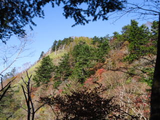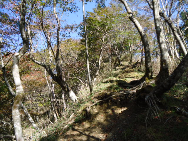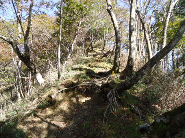 稜線に近ずくとだんだんと雑木林になっていきます。やはりこの山も崩壊が進んできていて、稜線の北側は深い谷になっています。 |