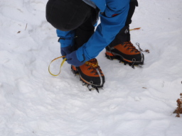 C君。新調したアイゼンの履き心地をチェックします。動物園の熊みたいに同じところを行ったり来たり。結構なお金をかけた甲斐がありなかなか良さそうでした。 |