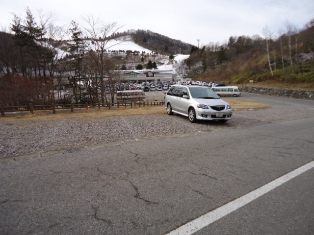 スキー場手前の無料駐車場に車を止めました。三連休とあってレストハウスに近い駐車場はスキーを楽しむ方の車が多く停まっています。 |