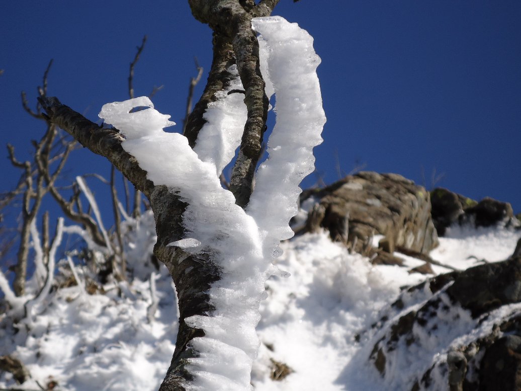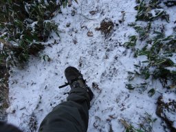 丸川峠から大菩薩嶺までは、山の北斜面を歩くことになります。先日降った雪が凍結しています。注意すれば問題はないのですが、せっかく持ってきたので軽アイゼンを装着しました。 |