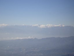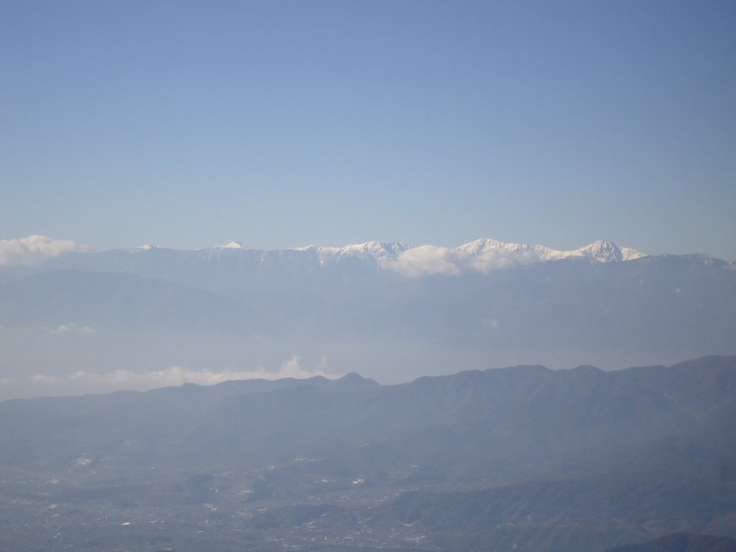 眼下に甲州市街地が広がり、その向こうには雪化粧をした南アルプスの雄大な姿を望むことができます。