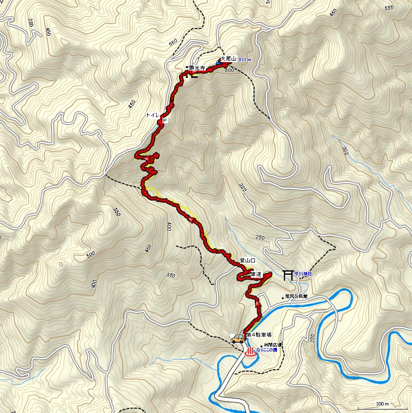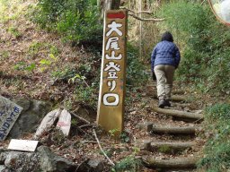 50mほど先に、大尾山ハイキングコースの標識が立っています。標識に従って左手の山の方に進みます。 |