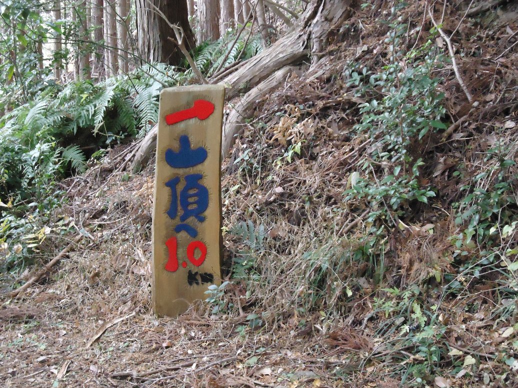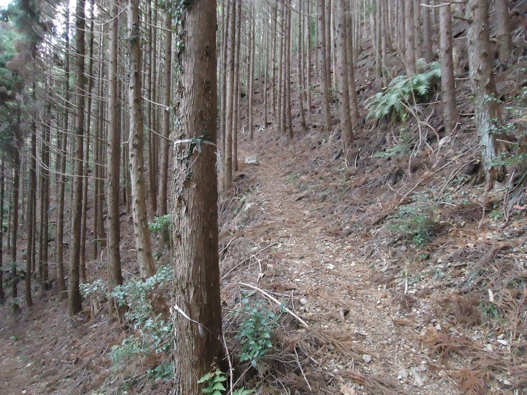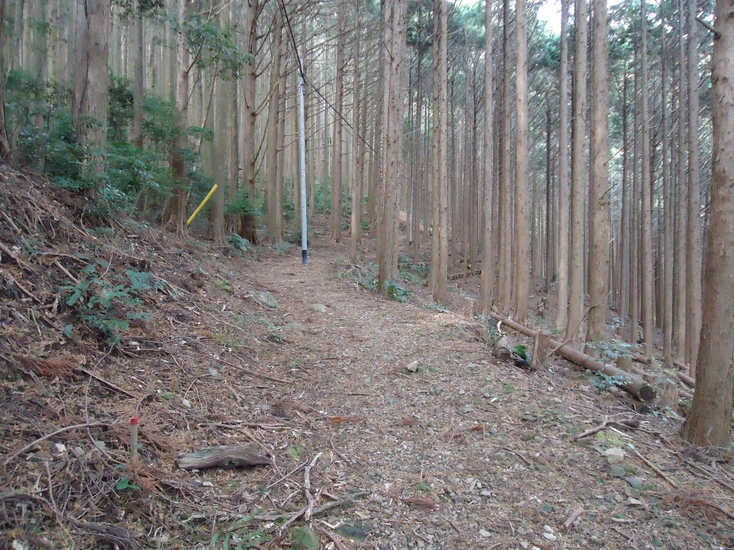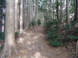 看板に従って登って行きます。 ずっと杉林の中です、周りの景色は見えません。 |