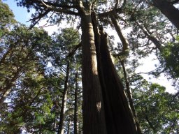 この杉、落雷のため、中が空洞になっています。その空洞の上の方から根っこが伸びてきて地面に達しています。すごい生命力ですね。 |