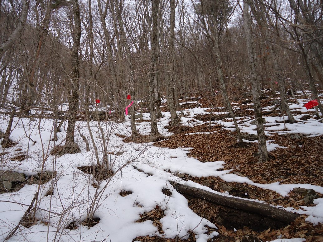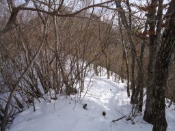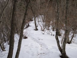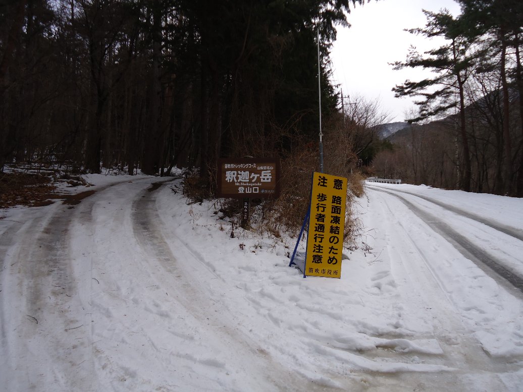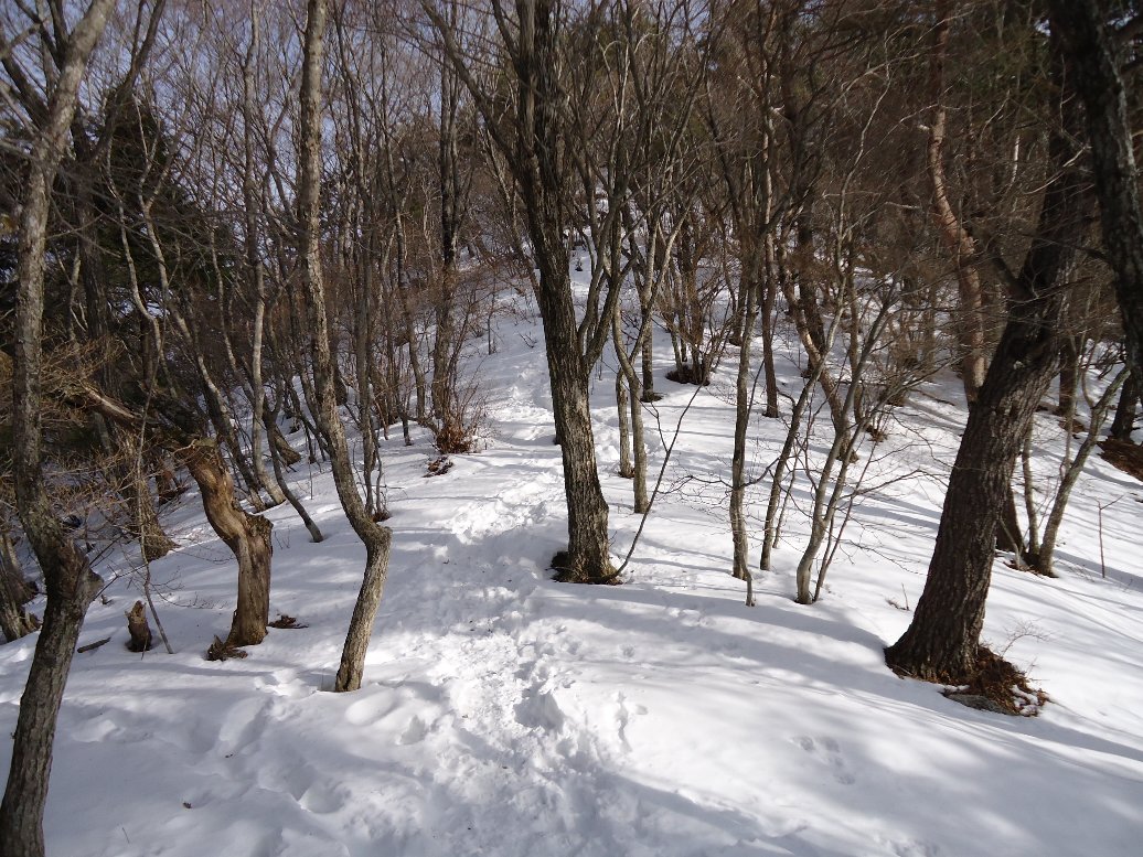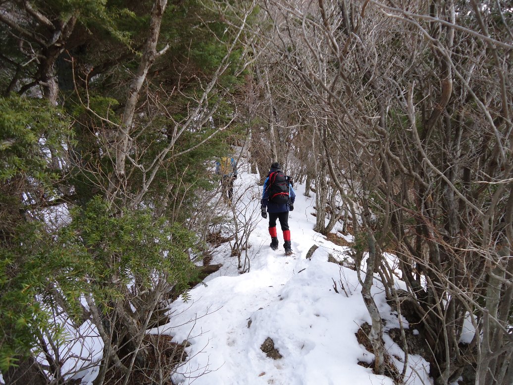 雪の量は少ないのですが、ガチガチのアイスバーンになっていました。ここ2〜3日の暖かさで雪が解けて夜に凍ったのでしょう。早々にアイゼン装着しました。 |