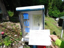 料金所。混雑時期には人がいるとは思いますが、本日は無人です、でもしっかり\300円を貯金箱に入れて出発です。 張り紙があり裏登山道も今年の4月からは通行可能と書いてありました。 |