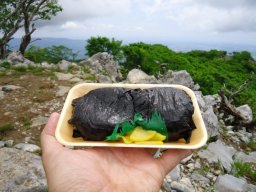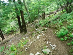8合目まで戻り、帰りは裏登山道を下りました。表より急坂です。湿っているせいか、疲れのせいか2回もこけてしまいました。気を抜いちゃいけませんね。 |