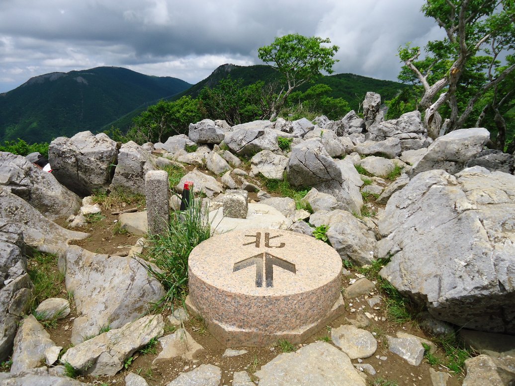 | 広々とした山頂です。360度の視界が開けます、あいにくの曇り空でしたが、遠くの山々までよく見えました。 |