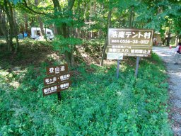 登山道の看板があるのでそれに従いテント村の中に入っていきます。 |