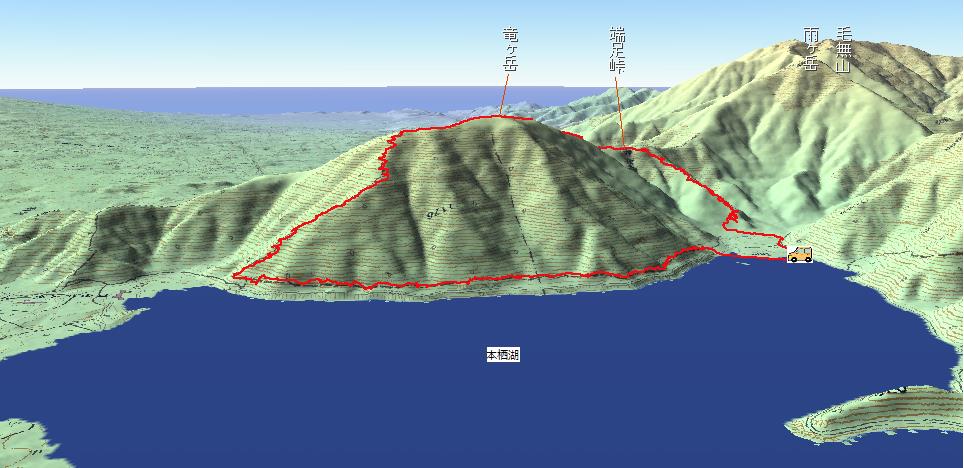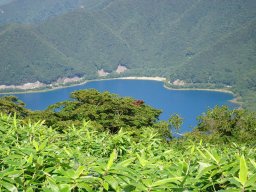 真っ青な本栖湖に向かって下りていきます。 |