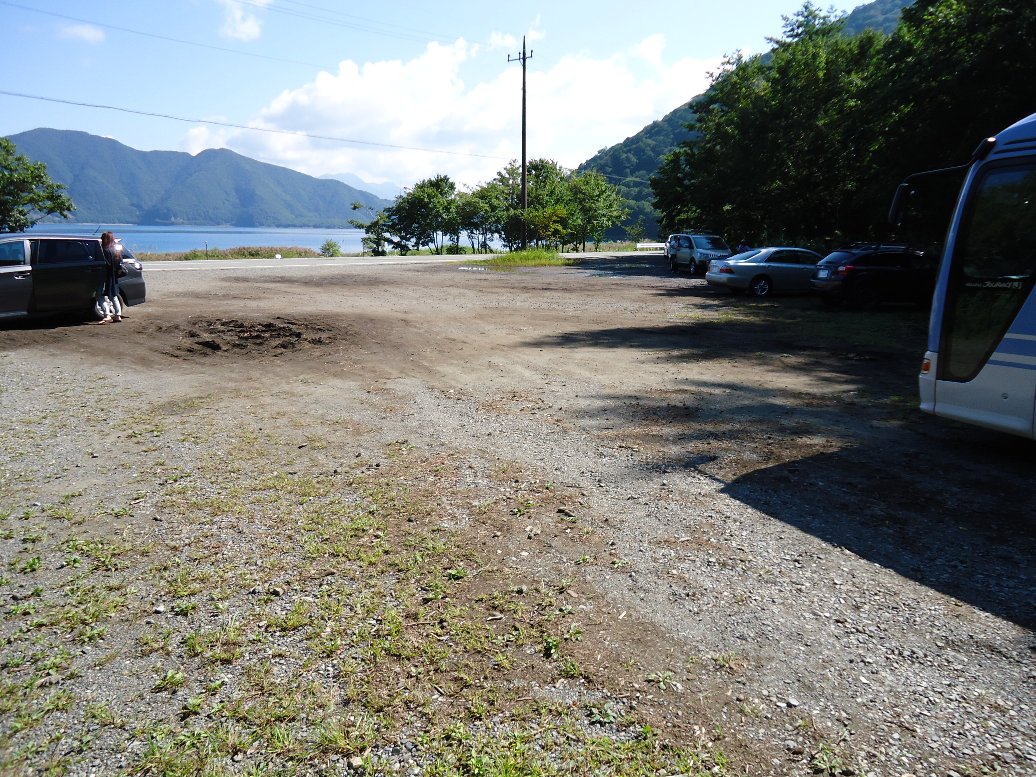 本栖湖湖畔の洪庵テント村の前の広い空き地に駐車します。 |