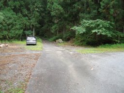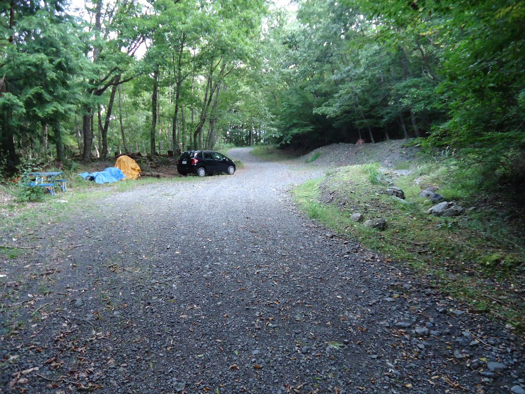 しばらく登っていくと、また分かれ道があり、そのわきに1台車が止まっていました。 ここで右の林道を進みましたが、おそらくここで道を間違えたのではないかと思います。 実際に見て確かめてはいないのですが、家に帰ってWebで調べた結果、このあたりに尾根を登る登山道の入口があるのではないかと思われます。もうチョイまっすぐに行って右側を調べるべきでした。 |