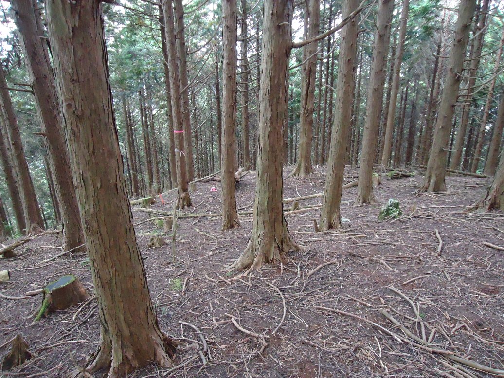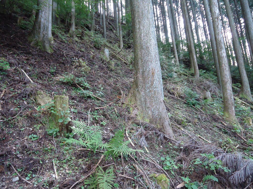 ハシゴの上には登山道の形跡は全くなし、おそらく林業関係者用のものだったでしょう。でもすぐ上には尾根が見えるのでそこまでなんとか登ってみました。 |