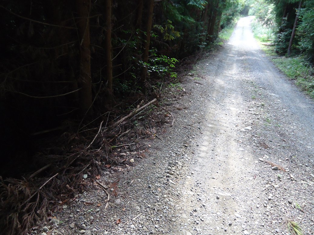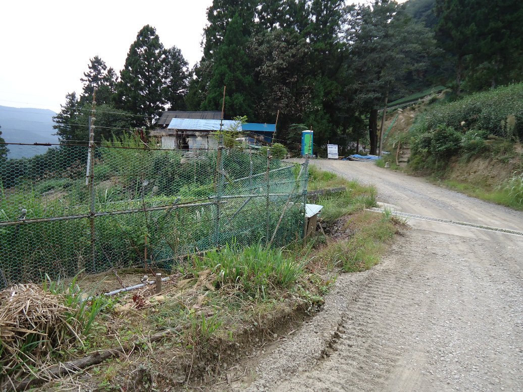 持って行った地図とGPSの地図ではこのあたりで左に下る登山道があるはずなのですが探しても見当たりません。 たまたま近くにシイタケ栽培のおじさんがいて、聞いてみるとこの林道をまっすぐに行って下りていくと小屋があるのでそこの脇の道を通ればいいと教えてくれました。