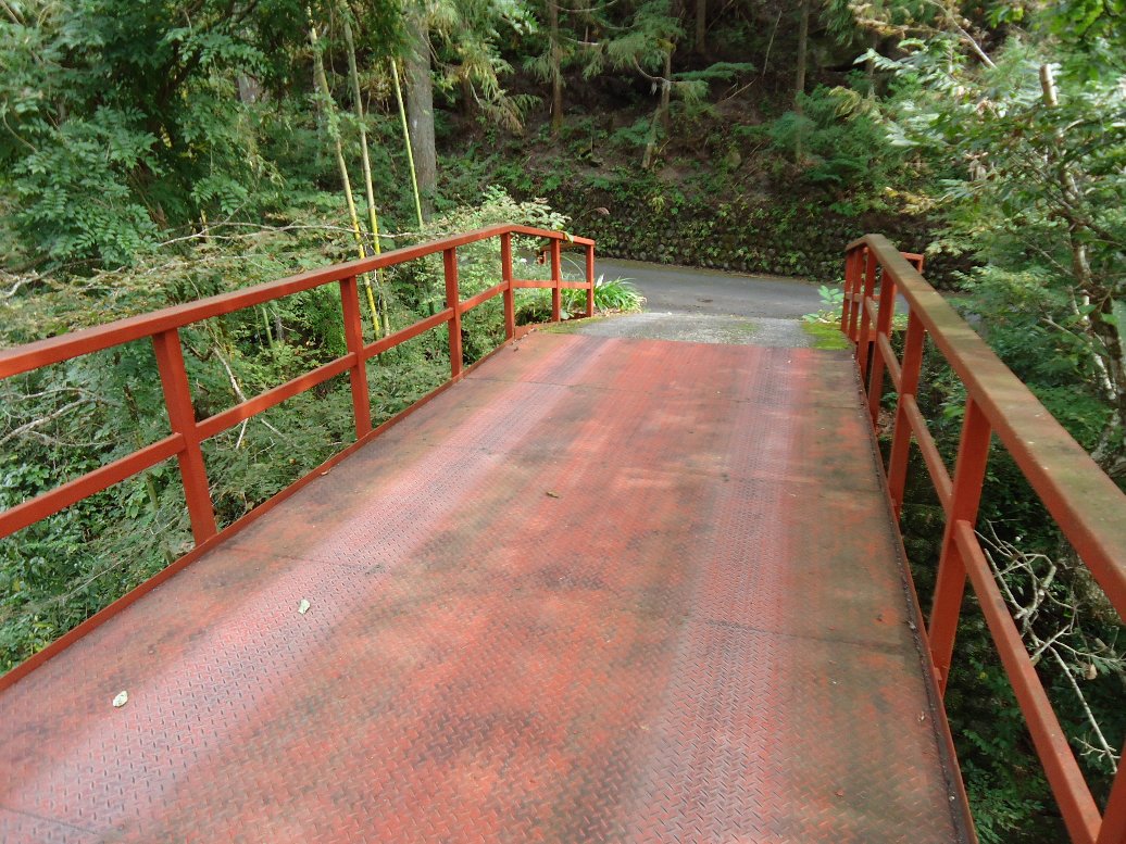 最後は民家の中を通り、赤い橋を渡って車道に出ます。ここにも登山道の案内はありません。 |