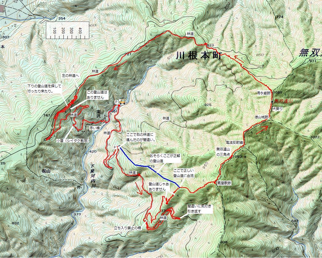 しばらく進みましたが、だんだん尾根からは離れて下っていくではありませんか・・このあたりで間違いを確証。とりあえず来た道を戻りました。 |