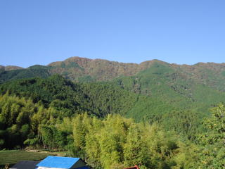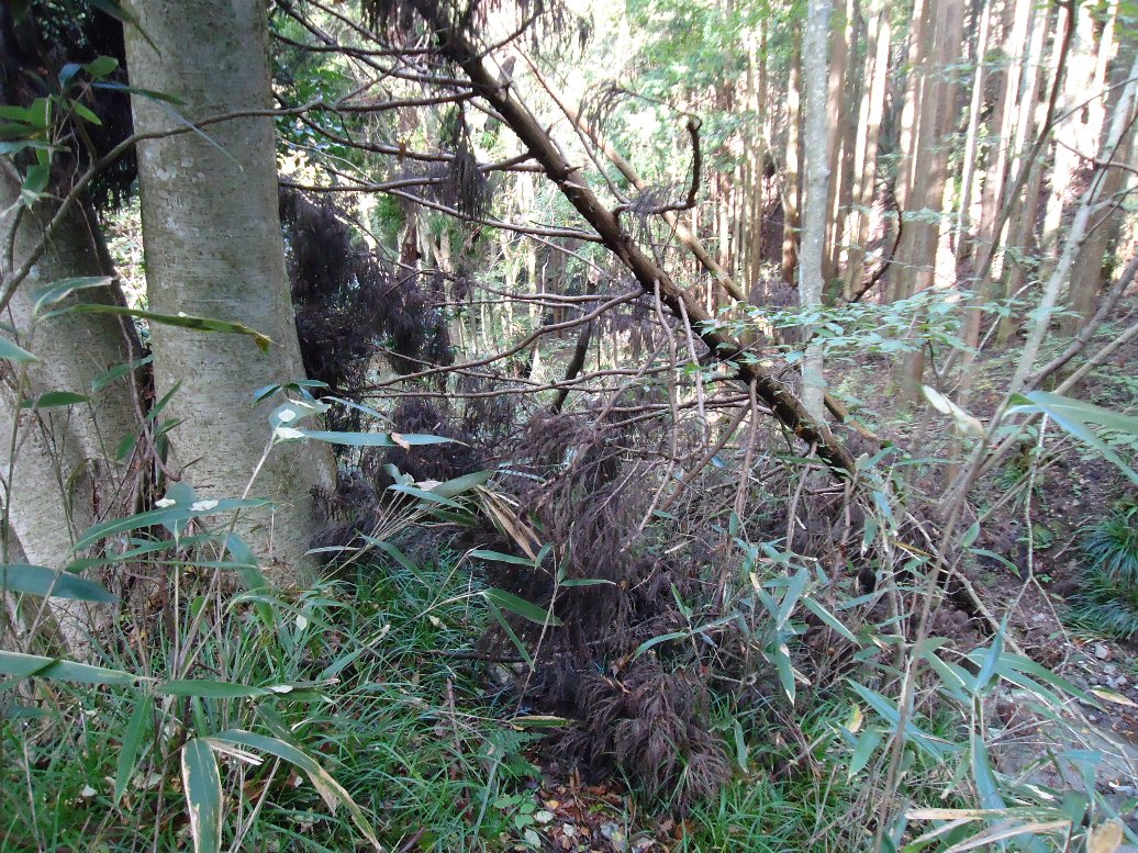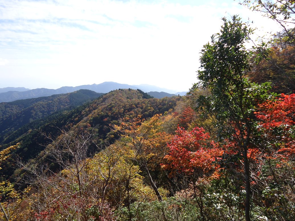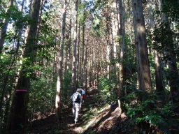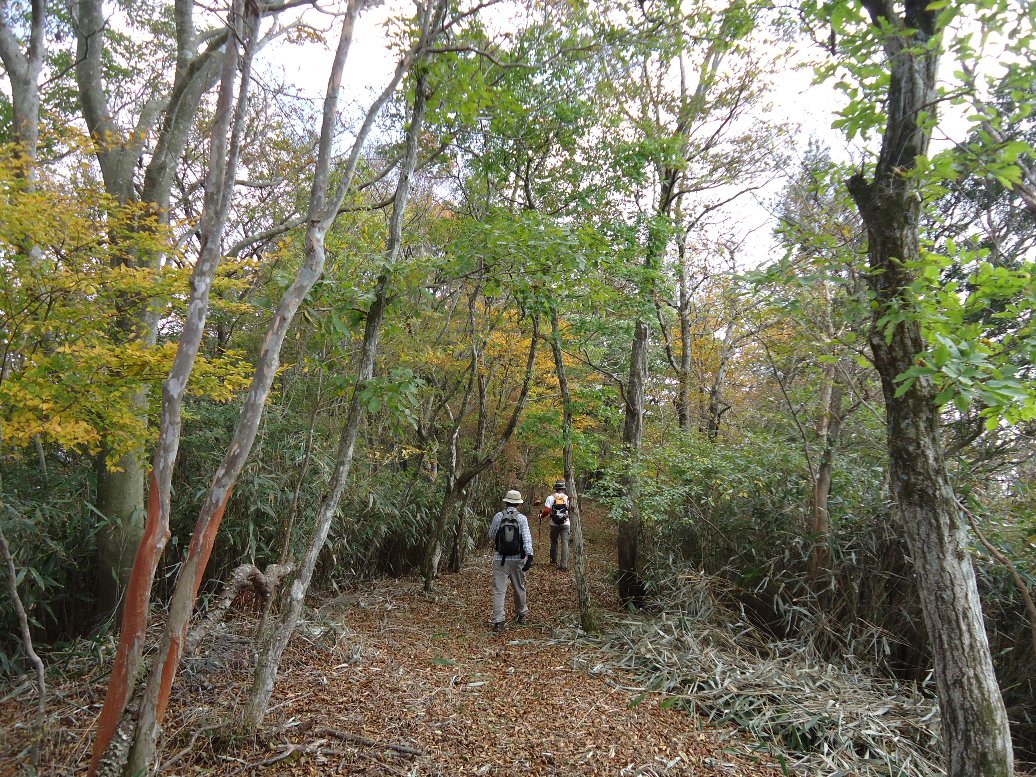 すぐに、杉林は広葉樹へと変わってゆきます。歩きやすい稜線を進みます。 |