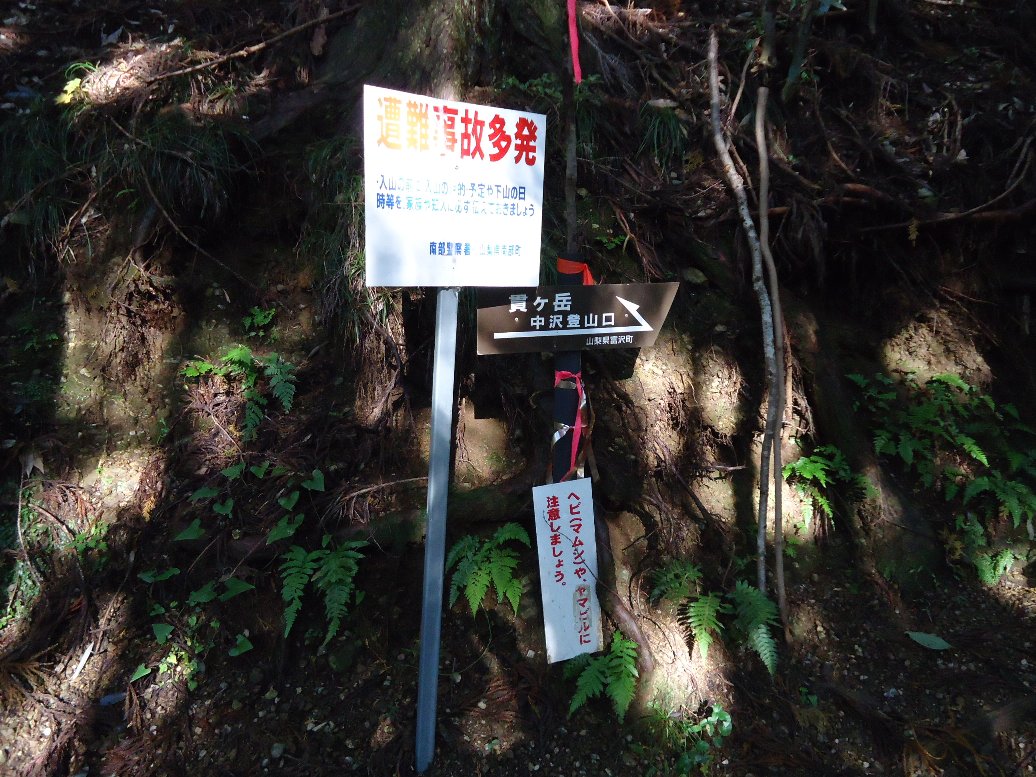 公民館の前を横切り、しばらく山の方向に向かって歩くと右側に貫ヶ岳中沢登山口があります。遭難事故多発、ヘビ、ヤマヒルに注意しましょうと書かれています。 |