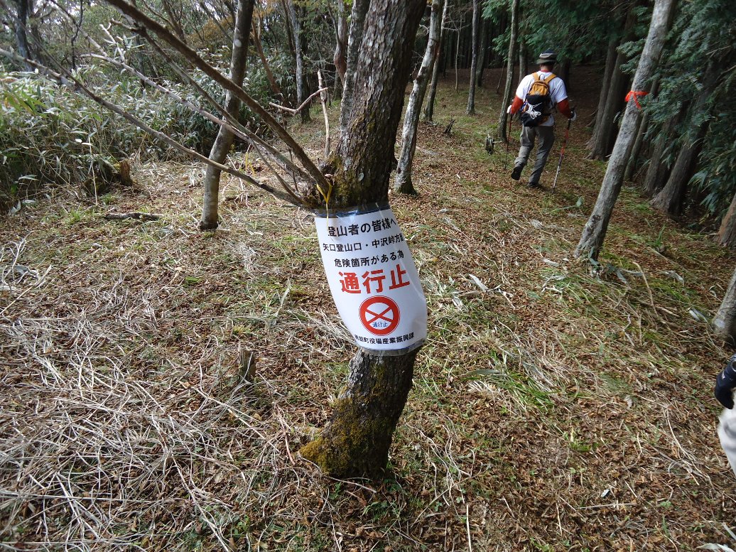 平治ノ段の先に通行止の看板が張られています。矢口登山口、中沢峠方面には危険個所があるようです。ですので進んではいけません。 |
