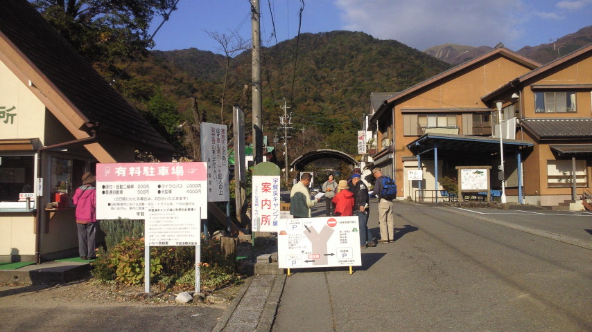 421号線から宇賀渓キャンプ場の看板に従って入っていくと駐車場があります。ここに駐車しました、料金は¥500円。入山料¥200円はこの駐車料金に含まれているとの事です。 係りの方に登山届を出すように言われ、登山届を出しました。 下山後も登山届に下山時刻を書くようになっていて、入山者管理が徹底されています。 |