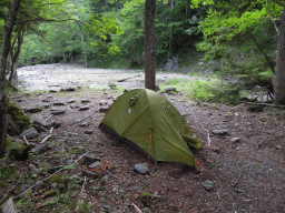 1段目、2段目はすでに満杯。3段目の端っこの特等席に場所を確保することができました。なかなかいい場所でしたがすぐ横に滝があり、夜中ずっとザァーとあめが降ってるような音が気になりなかなか眠れず。。 |