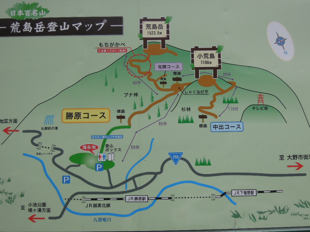 スキー場は閉鎖されているようですがきれいなトイレがあります。トイレの前には水道とホース、それに靴を洗うブラシも置いてあり、いたれりつくせりって感じ。荒島愛山会の皆様ありがとうございます。 |