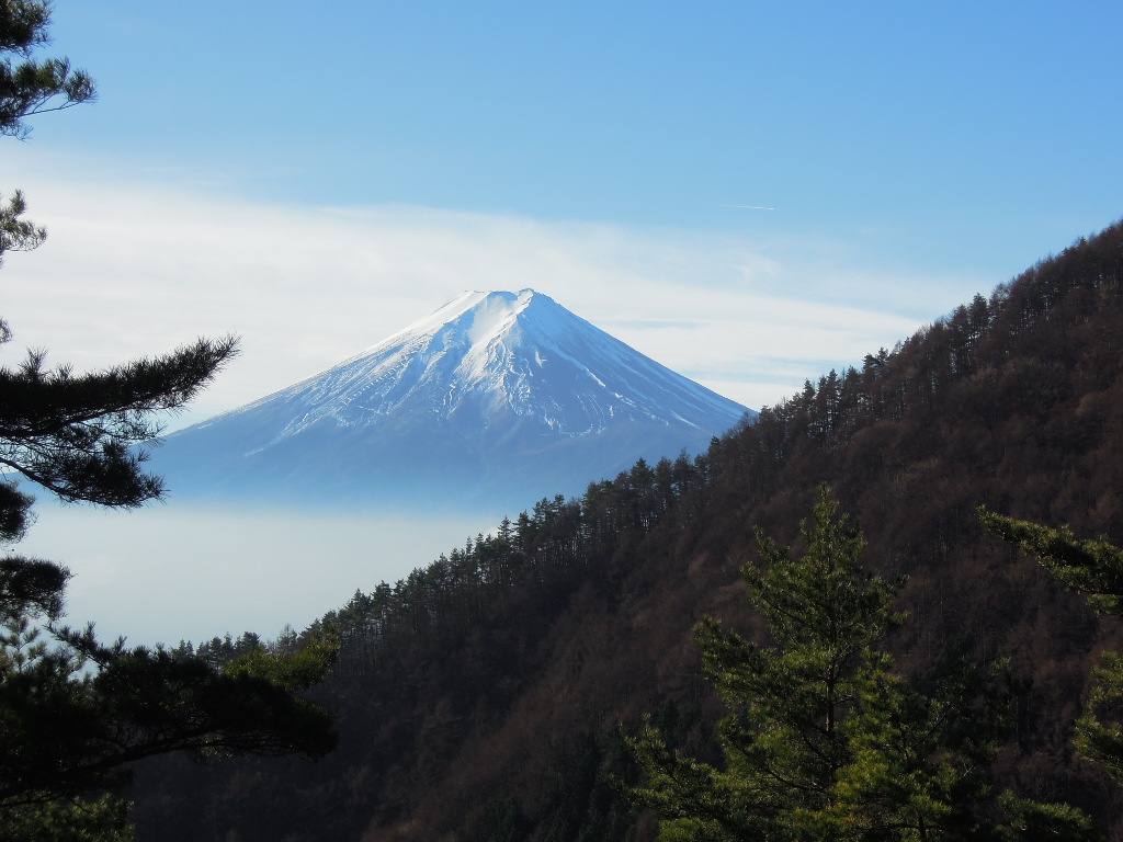 でこぼこした独特の形の三ツ峠山の山頂が見えてきます。 |
