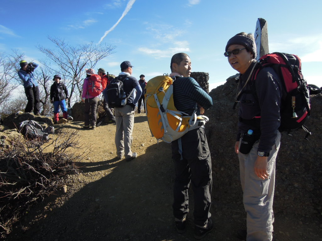 ザラメ地帯を登りきると山頂に到着します。予定通りちょうど3時間でした。 人いっぱい。 |