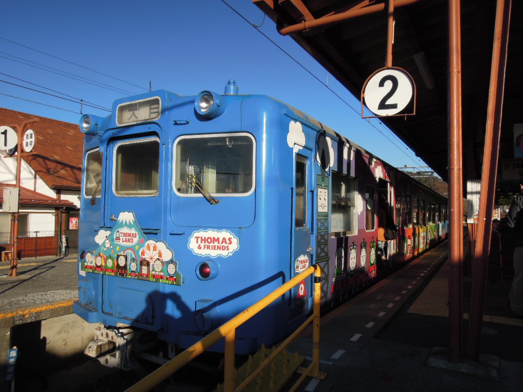 ここが今回のハイキングの終着点、、富士急行河口湖駅です。ちょうどうまい具合に電車の発車5分前。\550円で切符を買い、三ツ峠駅まで乗車します。 |