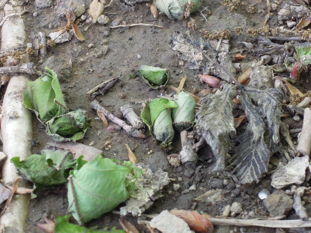 地面を見ると丸まった葉っぱだらけ。見事なロールキャベツです。 |