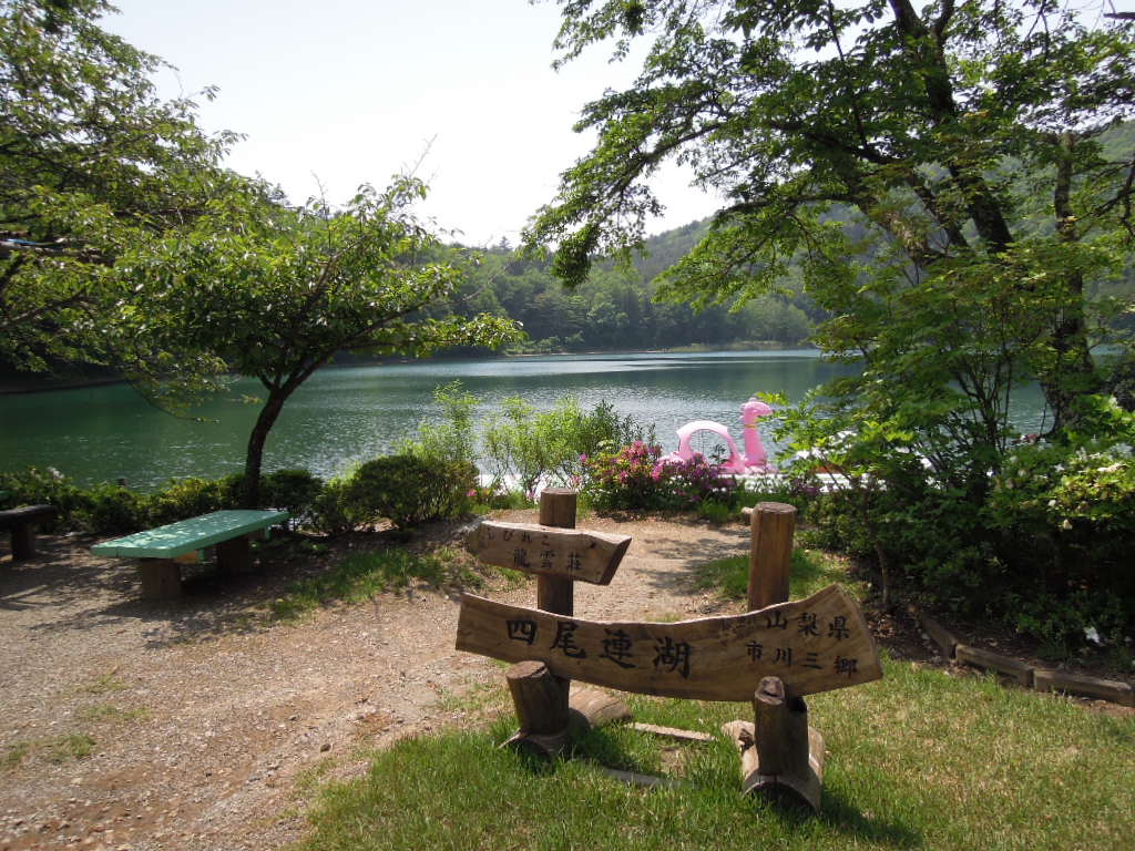 予定より早かったので、帰りに四尾連湖に寄ってみました。きれいな湖で周囲はキャンプ場になっています。涼しくて気持ちがよく30分ほど長居をしてしまいました。 |
